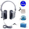 6 pack school headphones with Bluetooth boombox, audio jack box, and carry case for classroom learning.
